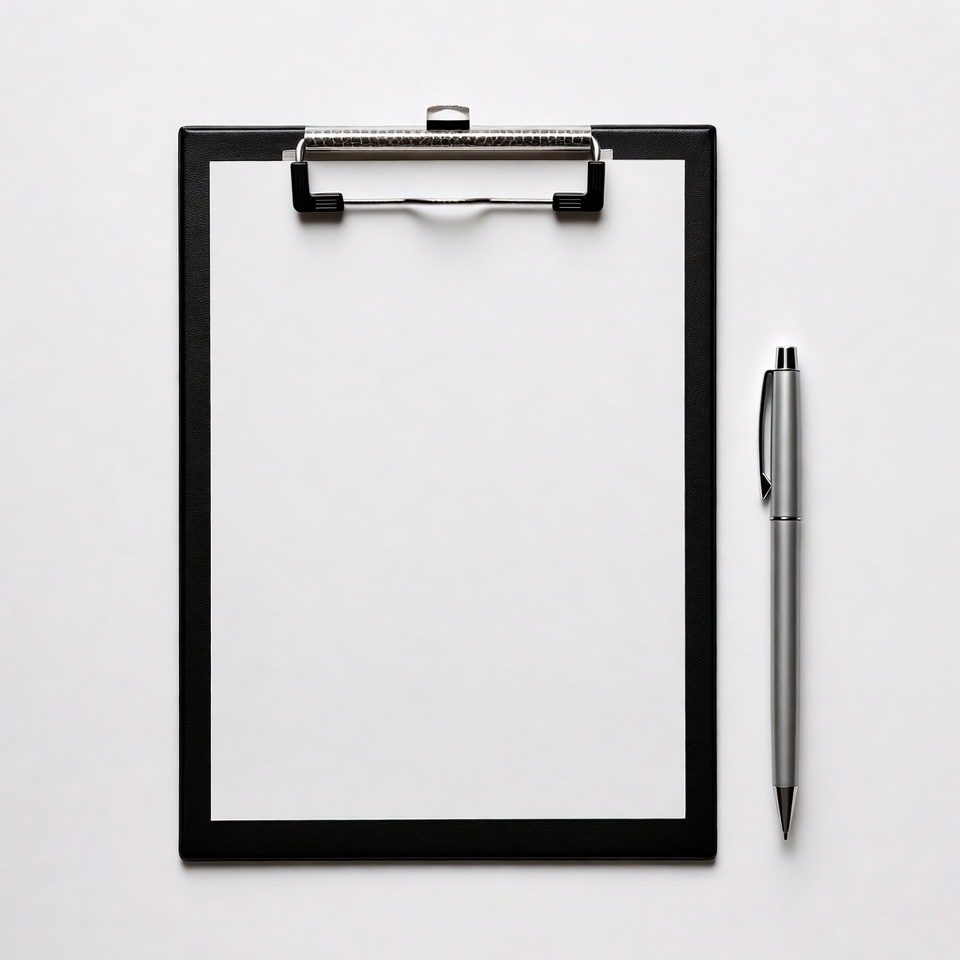 A black clipboard with a silver clip holds a blank white sheet of paper. A silver ballpoint pen lies beside it on a plain white background. The setup is centered and isolated for a clean, professional look.