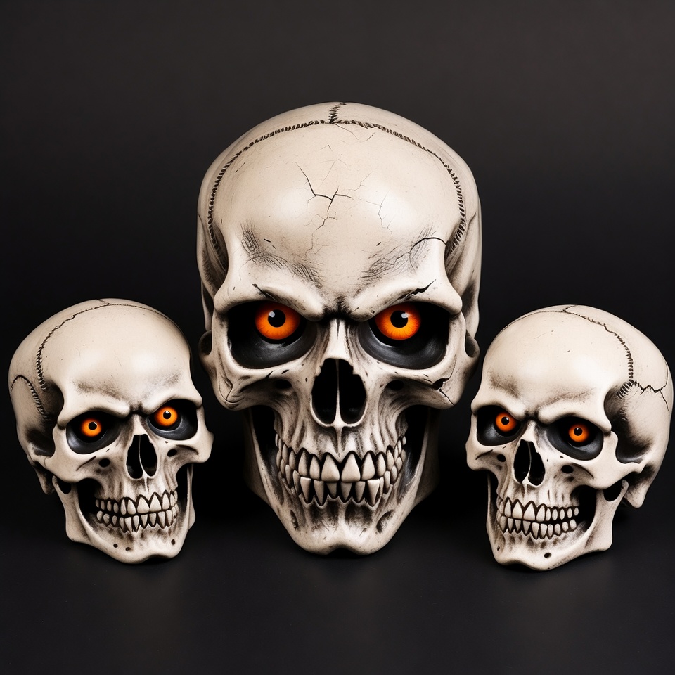 Three realistic plastic skulls with glowing orange eyes are arranged on a solid black background. The central skull is larger and faces forward with an intense expression, flanked by two smaller skulls on either side. All skulls feature cracked white surfaces and menacing grins.