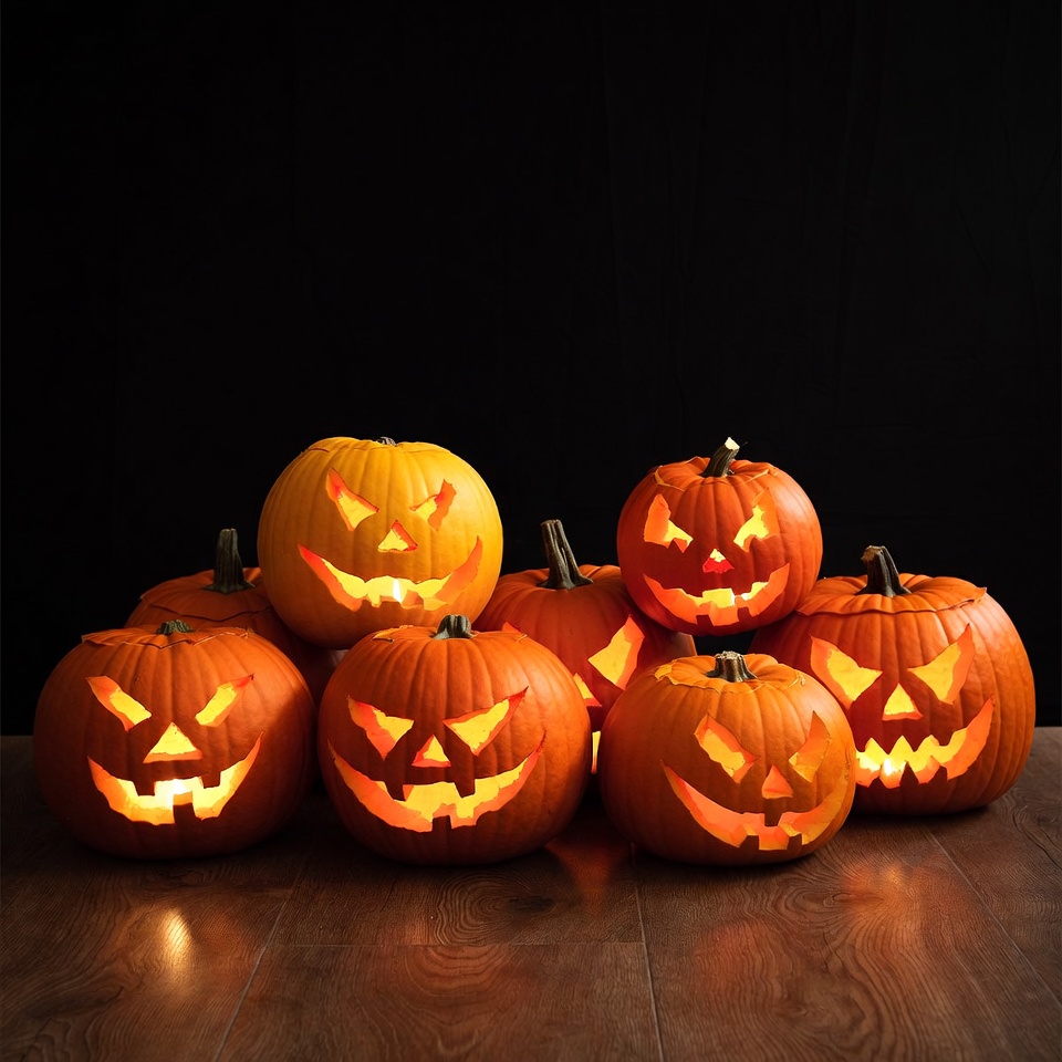 Multiple carved pumpkins with glowing jack-o'-lantern faces are stacked and arranged on a dark wooden floor. They feature jagged smiles and spooky eyes illuminated from within against a black background. The warm orange light contrasts with the dark surroundings.