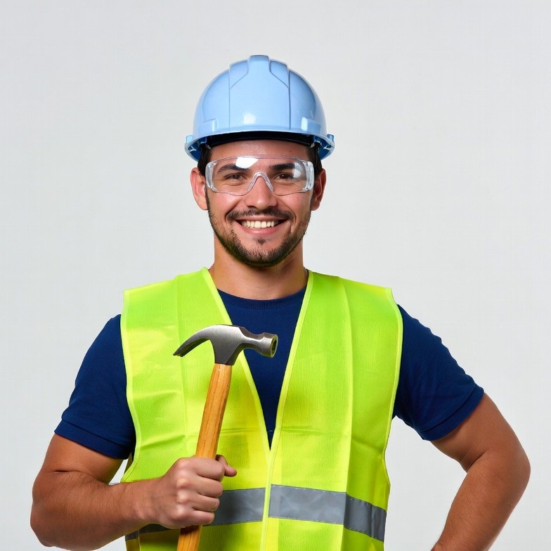 Latino, blue helmet, confident pose, goatee, hammer, hard hat, high visibility vest, male, man, muscular man, navy t-shirt, protective clothing, safety gear, safety glasses, smiling, standing, tool, white background, yellow vest, construction worker