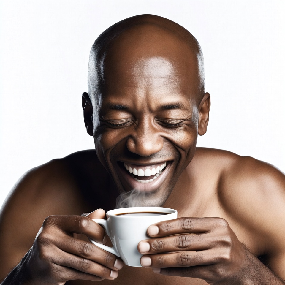 Black man, bald man, bare chest, close-up portrait, coffee cup, dark skin, happy face, holding cup, hot coffee, isolated background, joyful expression, laughing man, male, man, muscular man, smiling man, steaming coffee, white mug, wide smile, African-American man