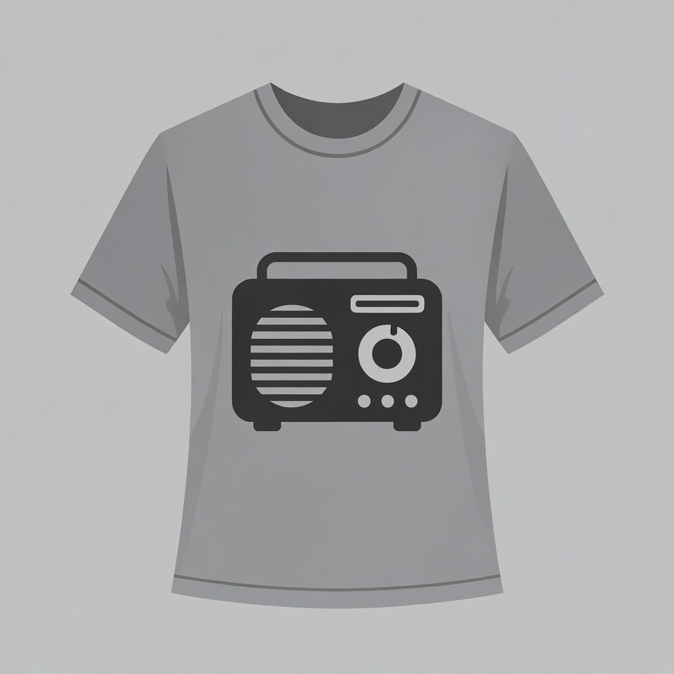 apparel, clipart, clothing, graphic tee, gray T-shirt, illustration, isolated background, portable radio, radio, radio graphic, silhouette, vintage radio, T-shirt