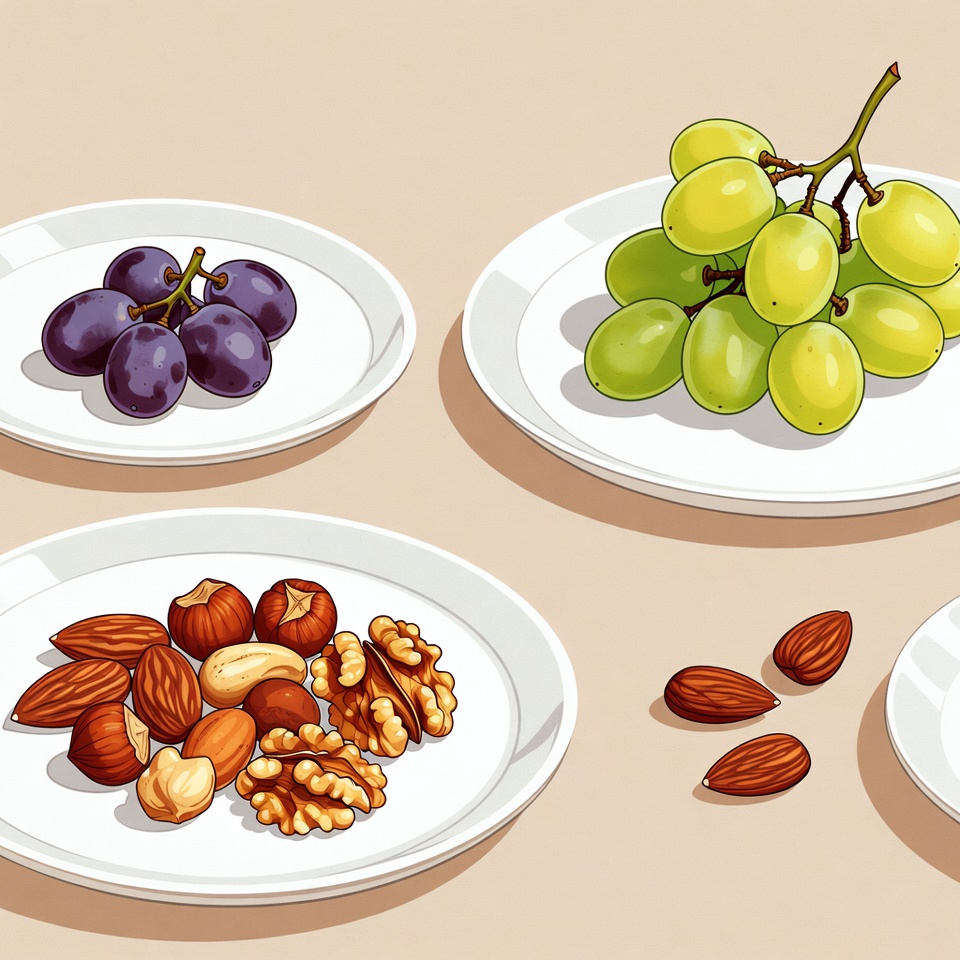 almonds, beige background, bunch grapes, clipart, food, fruit, green grapes, hazelnuts, healthy snacks, illustration, isolated background, nuts, nuts mix, purple grapes, scattered almonds, vector art, walnuts, white plates, grapes
