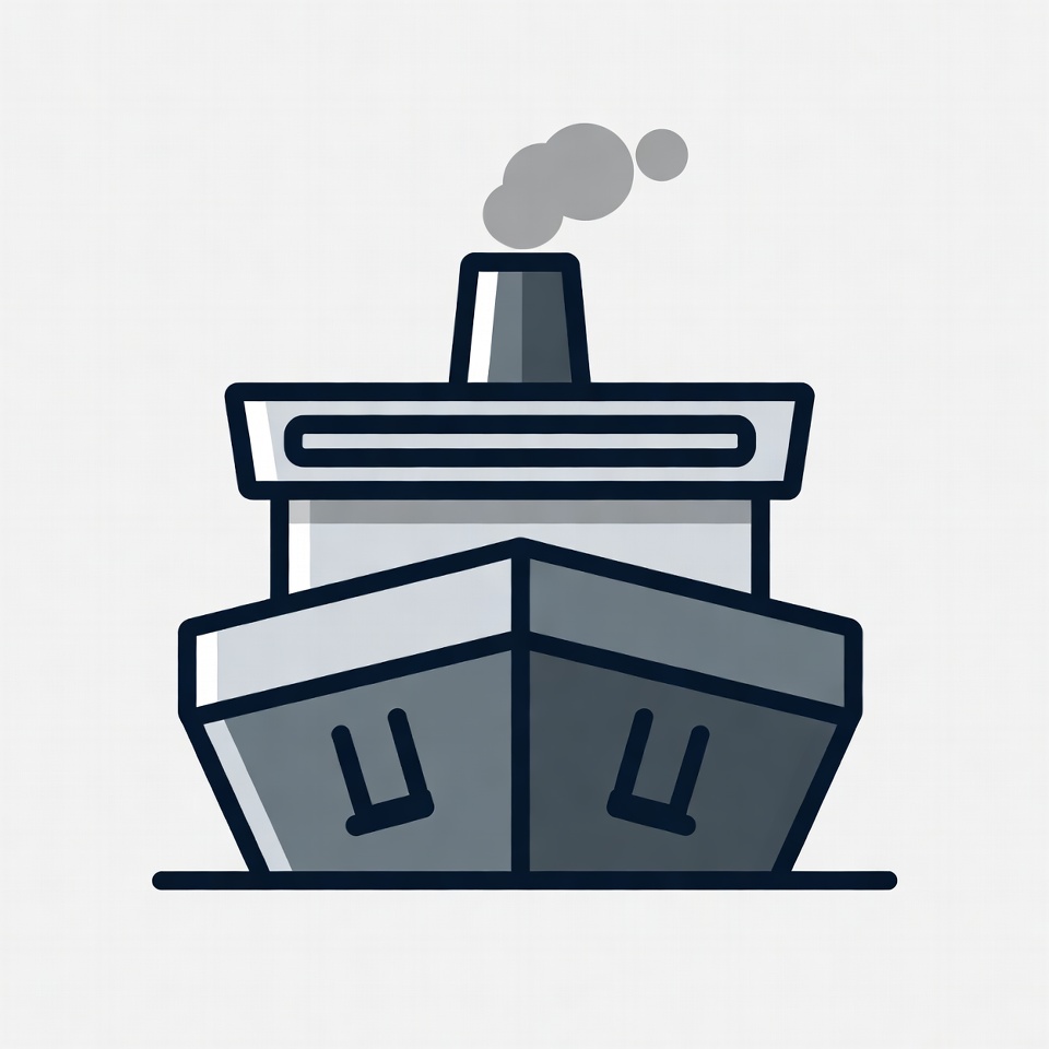 A simple flat illustration of a steamship viewed from the front on a white background. The ship features a tall smokestack emitting gray smoke and large gray hull with dark outlines. It has a white deck structure and simple line art details.