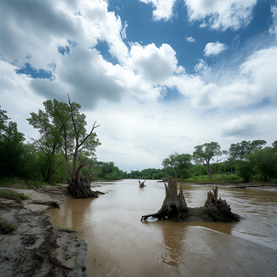 A muddy brown river flows through a landscape with numerous dead tree stumps protruding from the water and sandy banks. Green trees line the distant shores under a partly cloudy blue sky. The scene features exposed roots and driftwood along the muddy riverbanks.