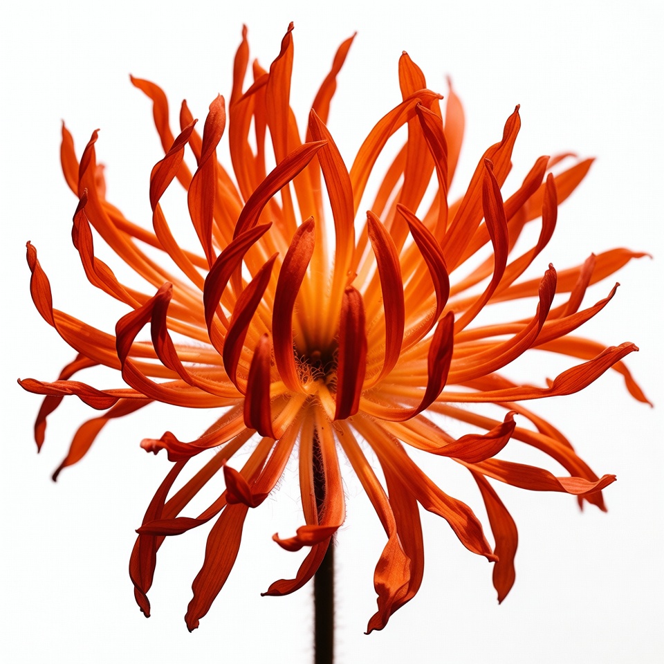 bloom, botany, chrysanthemum, chrysanthemum morifolium, fiery red, floral, flower closeup, golden center, green stem, isolated flower, long petals, mum flower, nature, petals, red petals, spider mum, vibrant orange, white background, orange flower