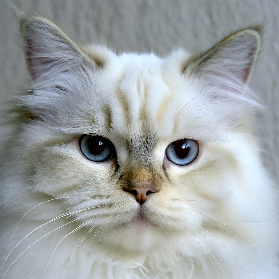 A fluffy Birman cat with cream and white fur stares directly at the camera with striking blue eyes. Its long whiskers and pointed ears are prominent against a plain gray background. The cat's face shows a pink nose and detailed facial fur texture.