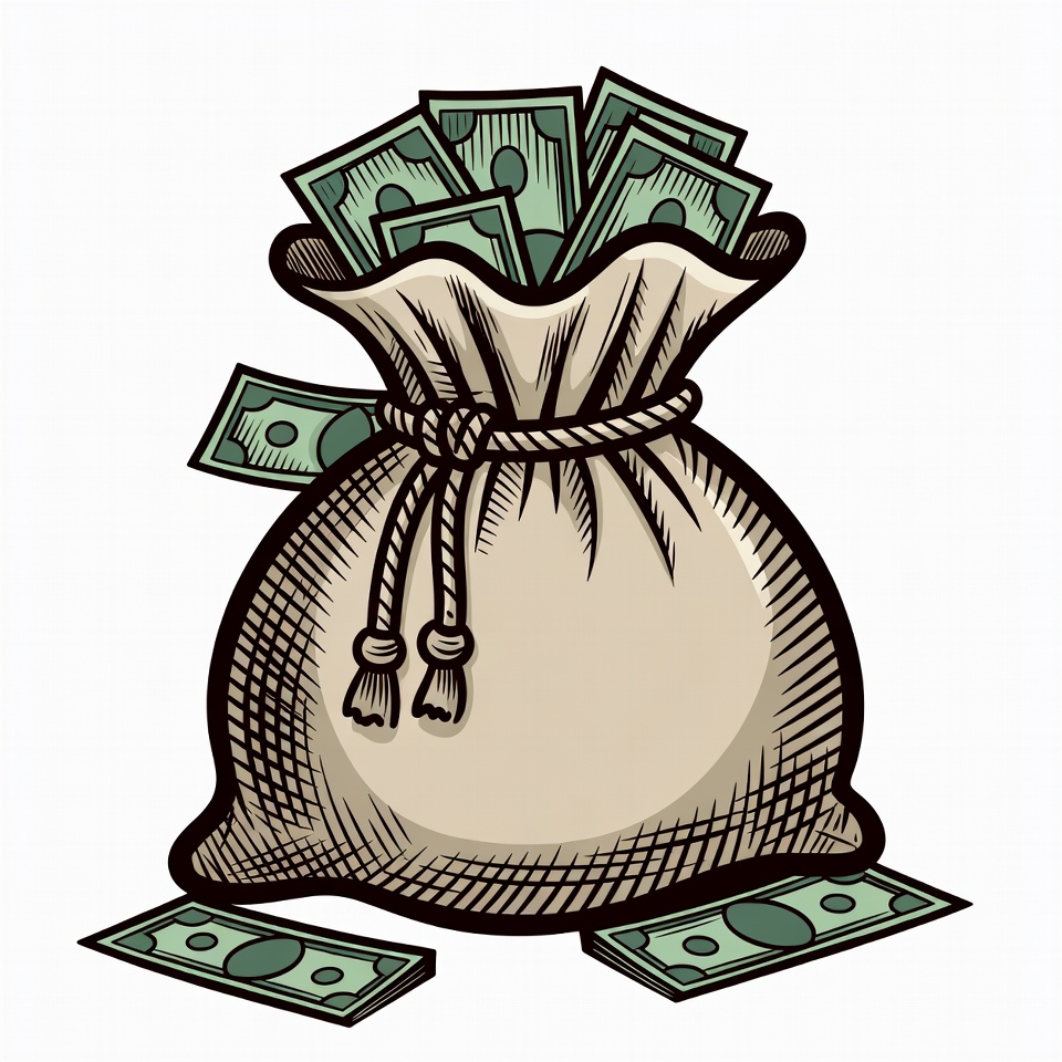 A hand-drawn illustration depicts a large beige sack overflowing with green dollar bills. The bag is tied with a rope and features bills spilling out from the top and bottom. The style is sketch-like with bold outlines and detailed shading.