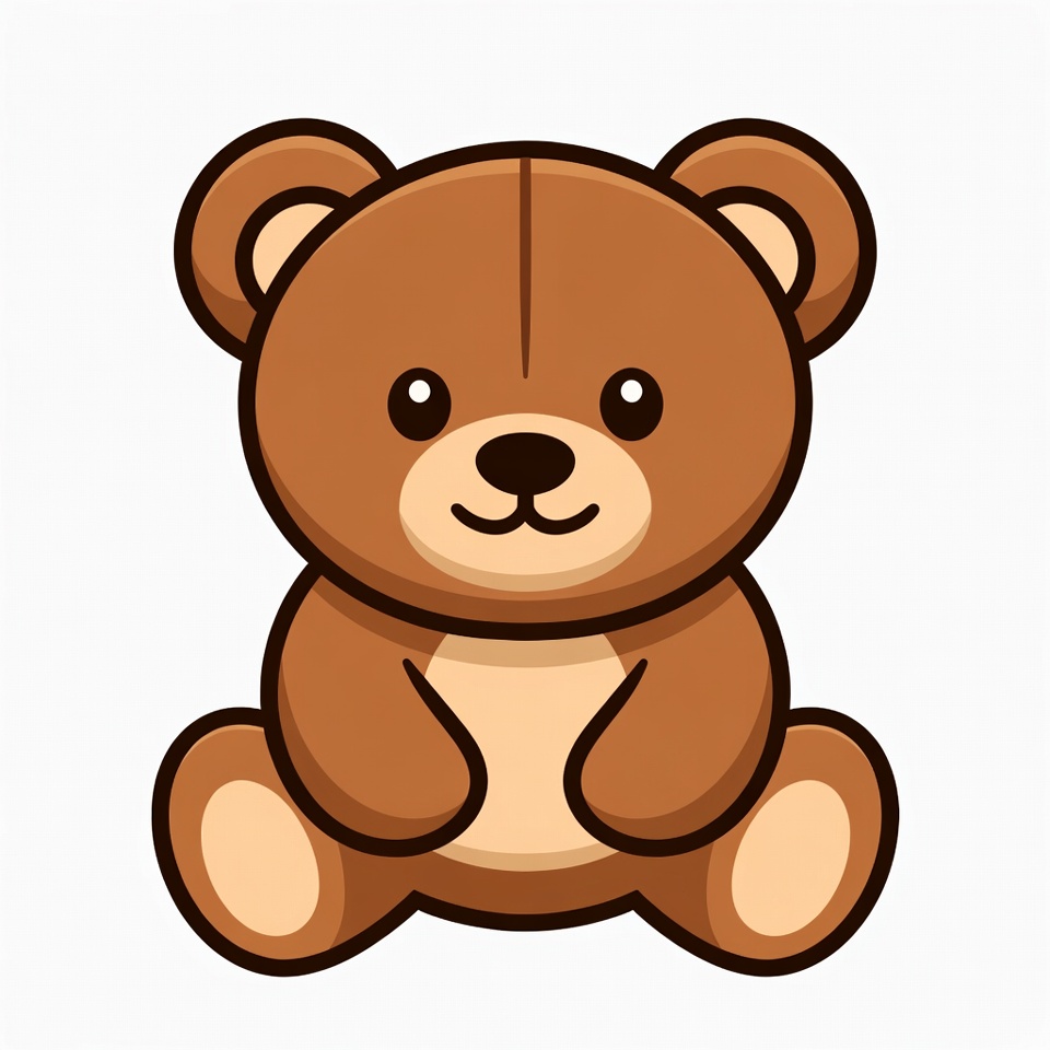 A cute cartoon teddy bear with brown fur and big sparkling eyes sits on a white background. It has a friendly smile, small rounded ears, and plush-like texture with outlined details. The bear's paws rest gently in front.
