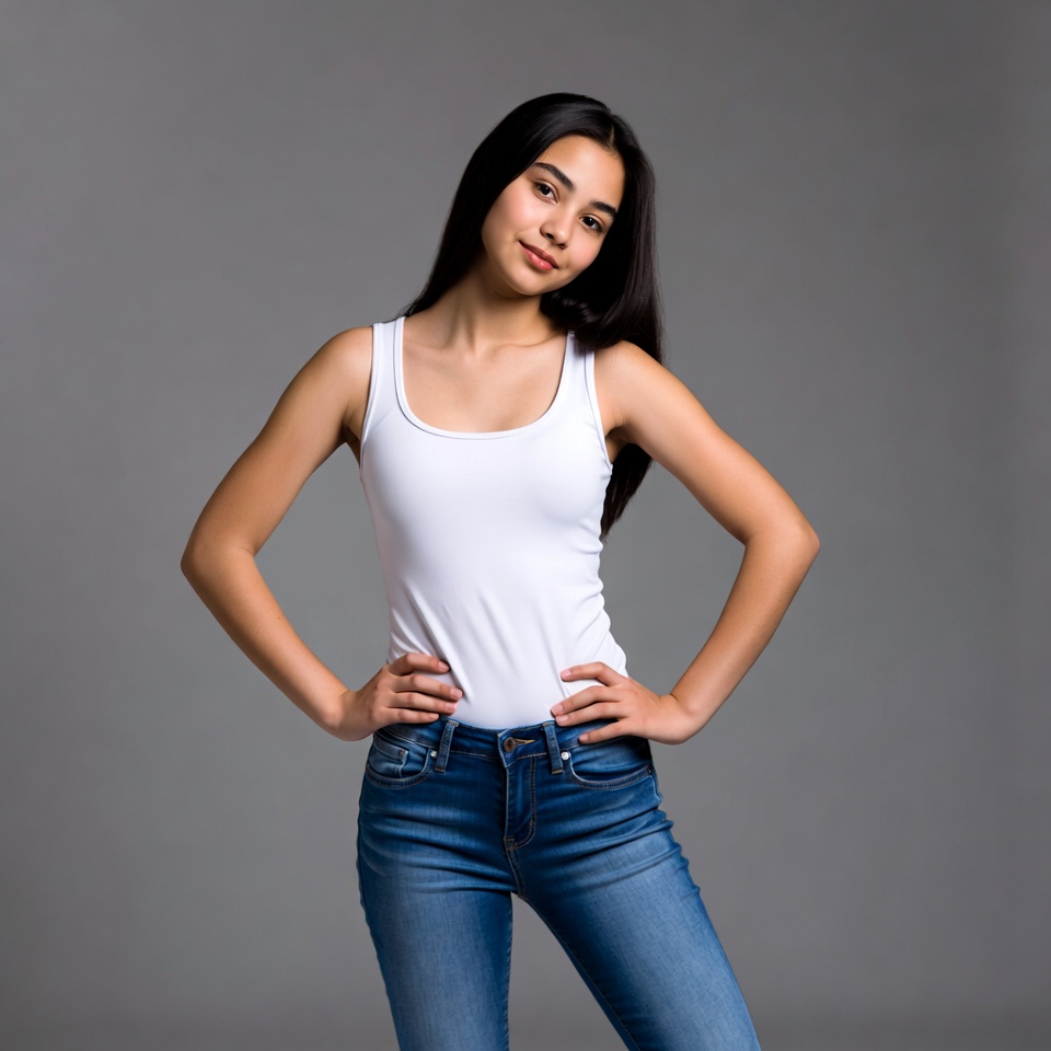 A young Asian girl with long straight black hair stands confidently with hands on hips against a gray background. She wears a white tank top and blue jeans, tilting her head slightly with a subtle smile. Her pose is relaxed yet poised.