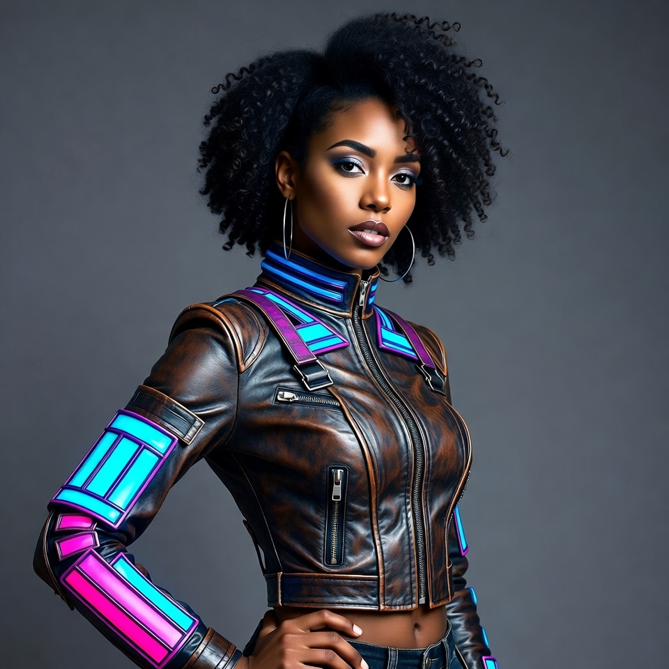 A young African-American woman with voluminous curly hair poses confidently against a gray background. She wears a brown leather jacket with vibrant neon pink, purple, and blue accents on the sleeves and collar, along with large hoop earrings. Her arms are crossed, emphasizing the futuristic design of her outfit.