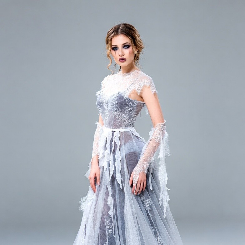 A young woman with wavy brown hair stands in a sheer gray lace gown with long fringed sleeves and a flowing skirt. She poses elegantly against a plain gray background, featuring dramatic makeup with bold eyes. The dress has intricate lace details and a high neckline.