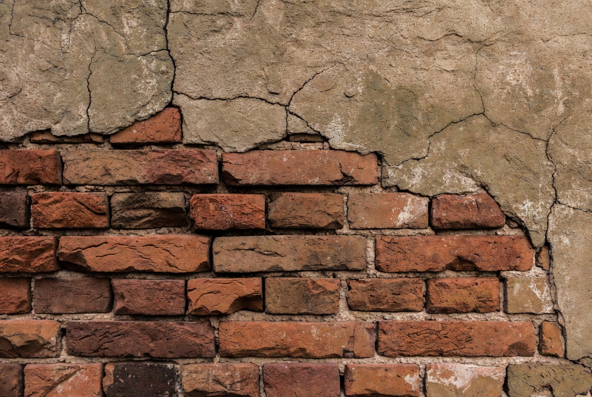 A close-up view of an old brick wall with exposed red bricks and peeling gray plaster. Cracks and weathered surfaces cover the textured facade. The wall shows a mix of intact bricks and crumbling stucco.