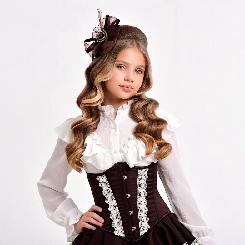 A young girl with long wavy blonde hair stands confidently against a white background. She wears a white ruffled blouse with long sleeves tucked into a brown corset and matching skirt. A decorative brown bow with feathers and gears adorns her updo hairstyle.