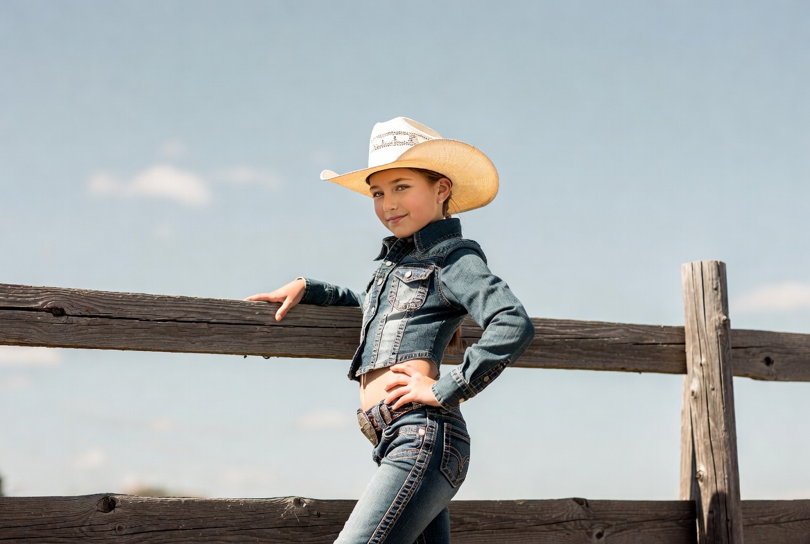A young girl with blonde hair wears a white cowboy hat, blue denim jacket, and jeans while leaning on a wooden fence. She stands confidently with one hand on her hip under a clear blue sky with scattered clouds. Her pose is casual and outdoors in a rural setting.