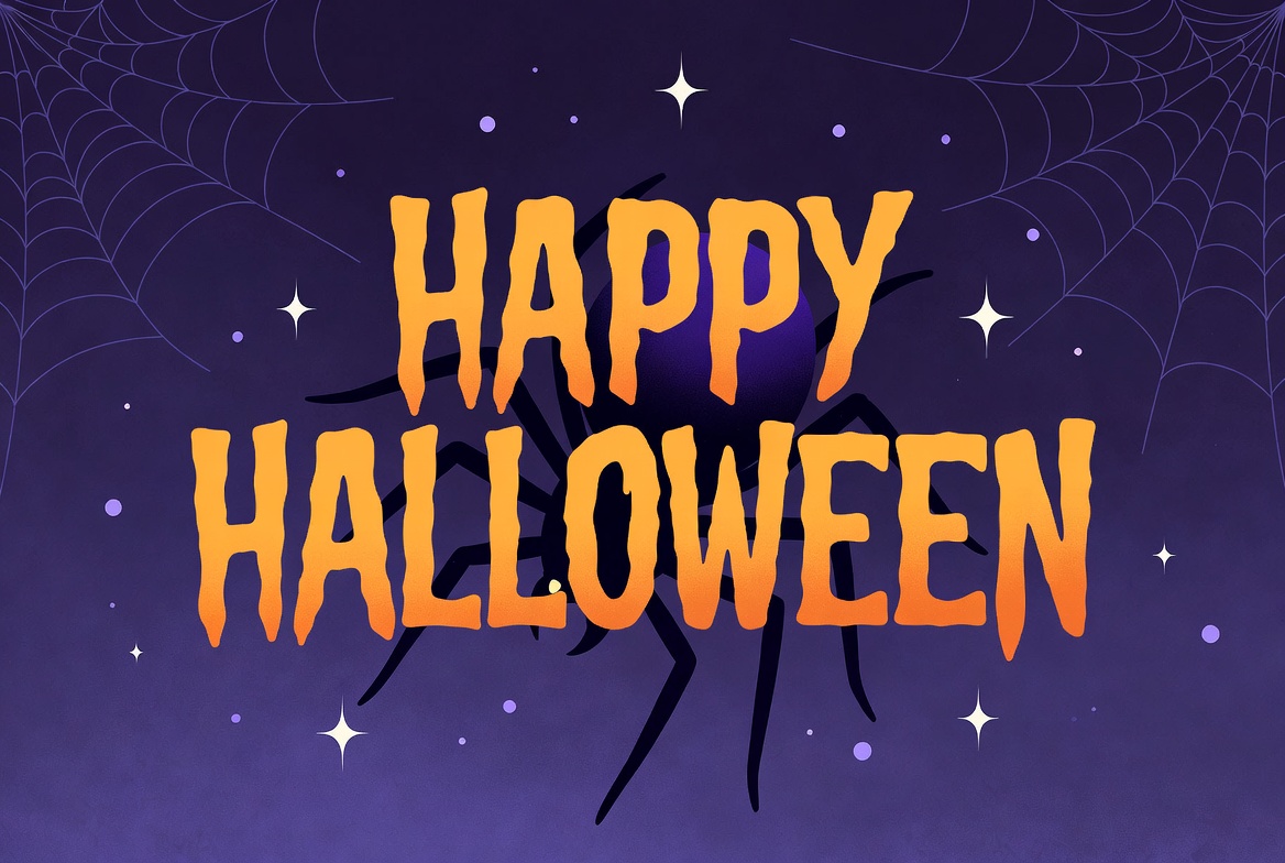 A vibrant digital illustration features the text 'Happy Halloween' in bold orange letters with a dripping effect. A large purple spider and spider webs decorate the purple background. Sparkles surround the festive Halloween greeting.