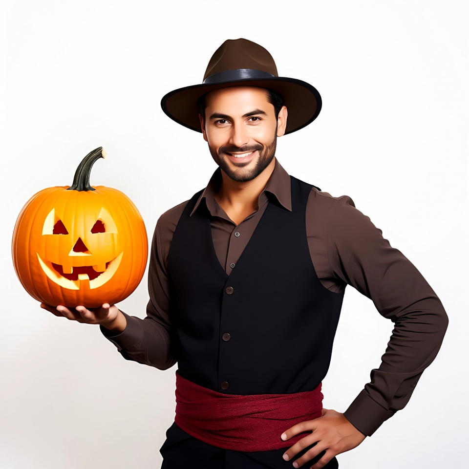 Halloween, Latino, black vest, brown hat, brown pants, carved pumpkin, costume, fedora hat, festive, holding pumpkin, isolated background, jack-o-lantern, male, portrait, pumpkin face, red sash, smiling, white background, white shirt, man