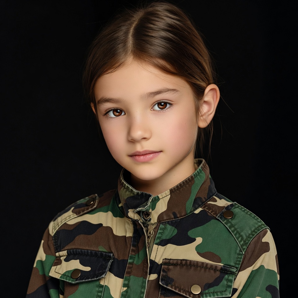 A young girl with long brown hair stands against a black background wearing a camouflage jacket. She has large brown eyes and a subtle smile, looking directly at the camera. The jacket features green and brown camo patterns with gold buttons.