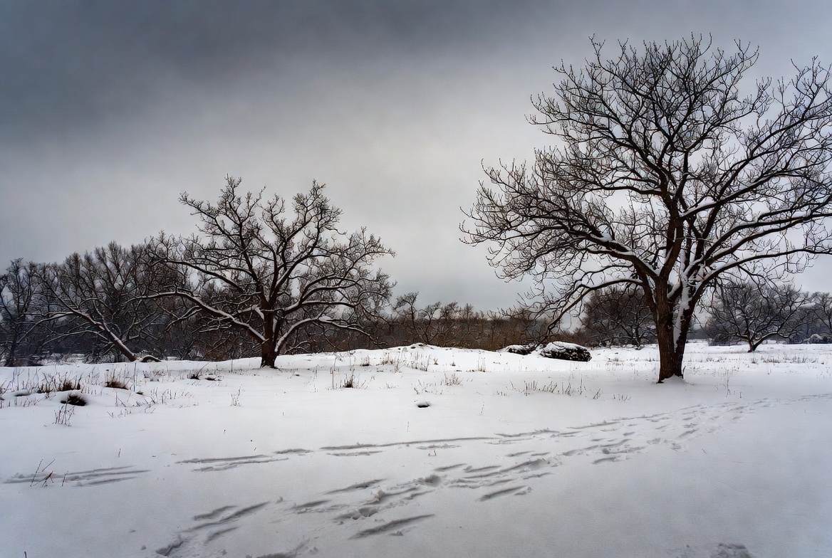 bare trees, clouds, cold weather, deciduous trees, field, footprints, frozen ground, gray sky, nature, outdoors, snow, snowy scene, trees, winter landscape, winter scenery, snowy field