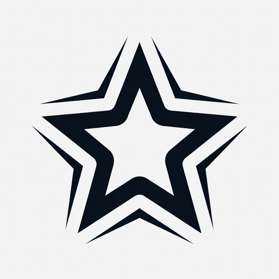A bold black five-pointed star with thick white outlines and inner black borders on a transparent background. The design features sharp, angular points and layered contours for a striking graphic effect. It is a simple vector illustration suitable for icons or logos.