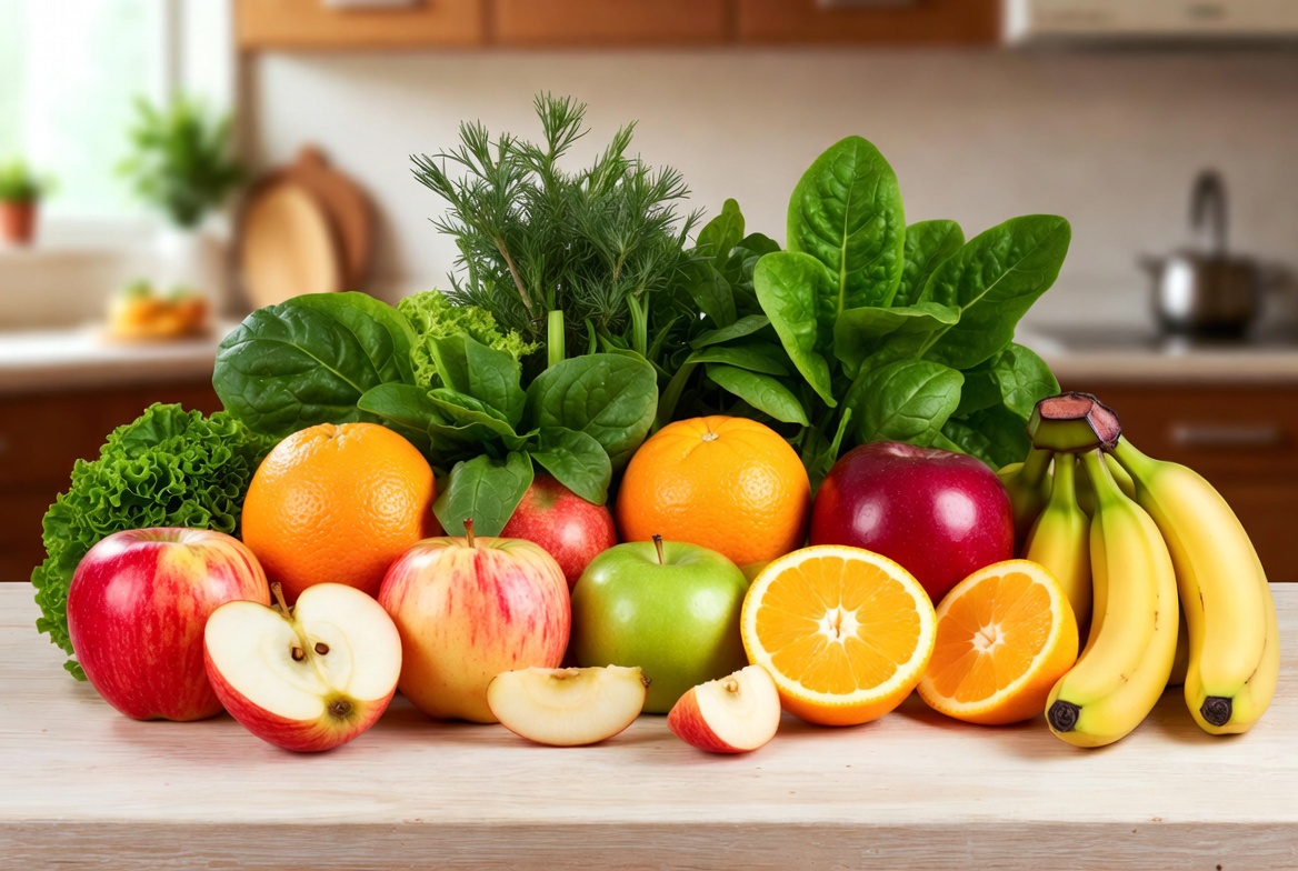 A vibrant assortment of fresh fruits and vegetables is arranged on a wooden kitchen counter. Red apples, green apples, oranges, bananas, spinach leaves, and dill are prominently displayed. Wooden cabinets and kitchen utensils are visible in the background.