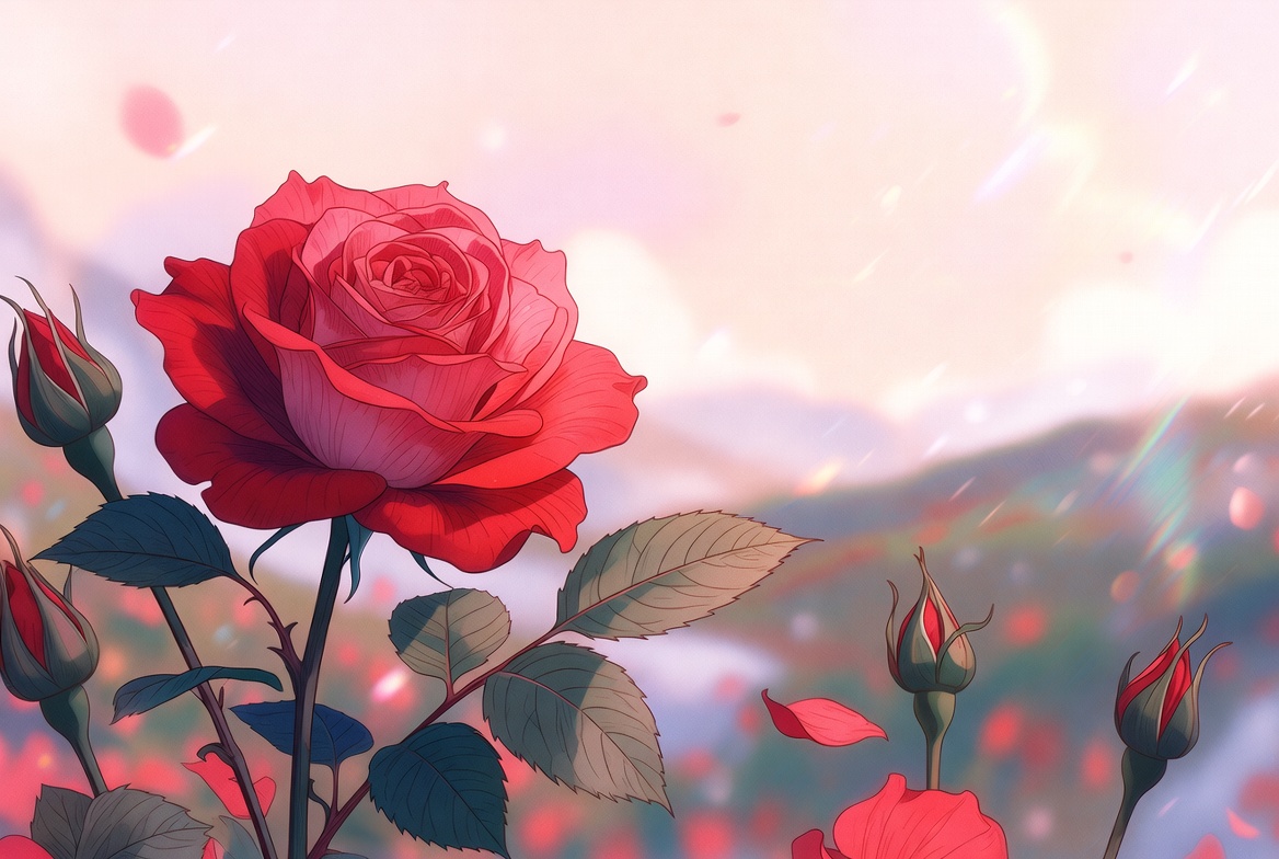 anime style, blurred background, closeup flower, digital art, floral art, flower buds, green leaves, illustration, nature illustration, petals, pink background, rose bloom, rose flower, vibrant colors, red rose