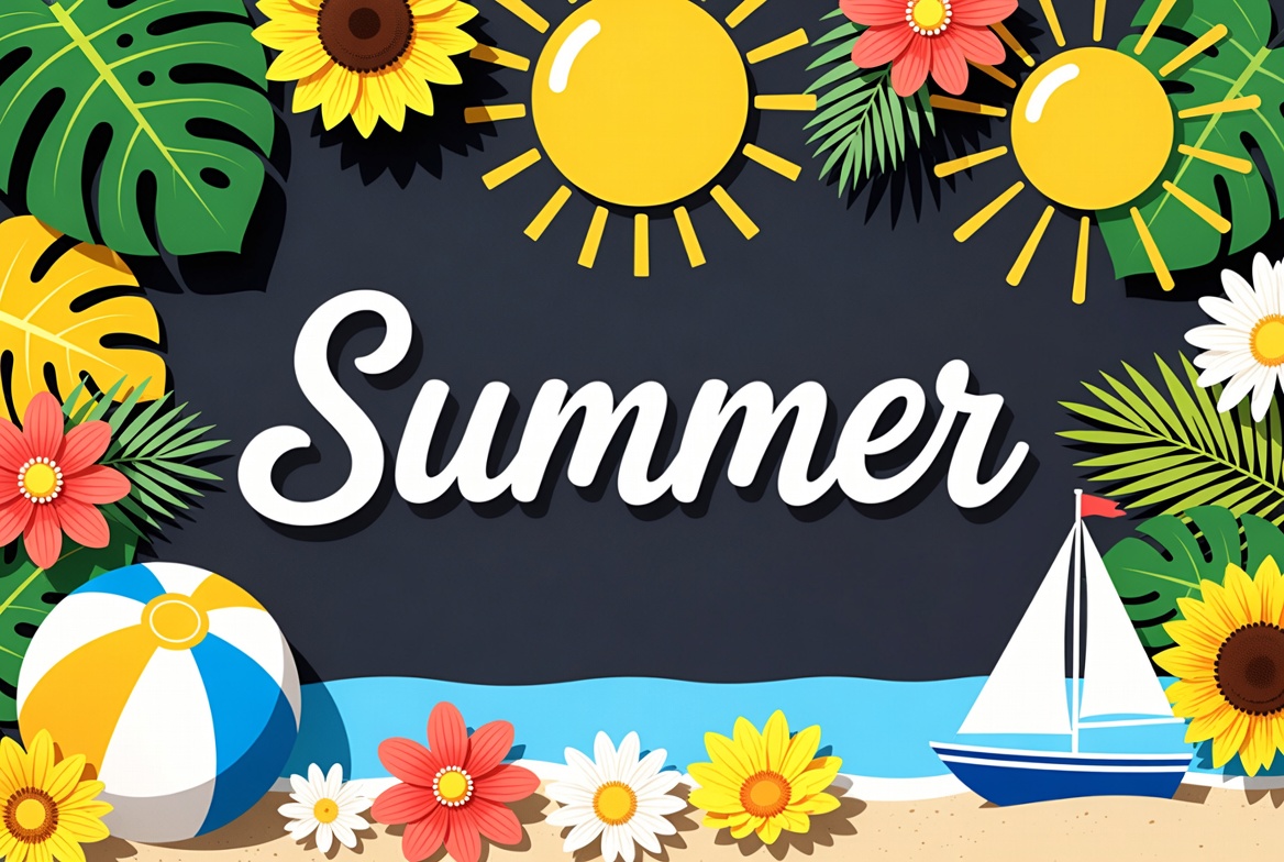 A vibrant vector illustration features the word 'Summer' in white cursive text centered on a dark background. Surrounding it are bright yellow suns, tropical green leaves, colorful flowers like sunflowers and daisies, a beach ball, a small sailboat, and sandy beach with ocean waves. The design uses bold, flat colors typical of clipart style.