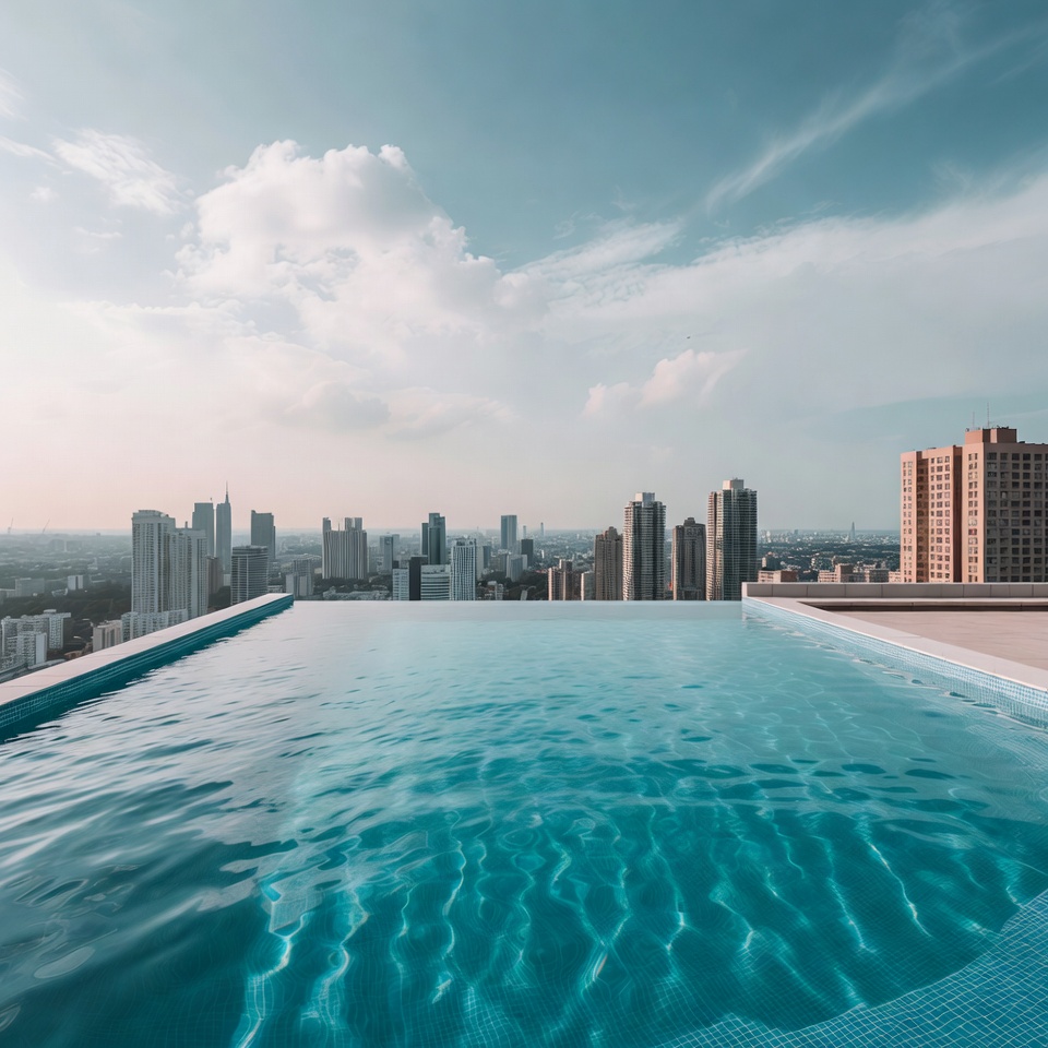 blue water, city skyline, cityscape, clear water, cloudy sky, high angle view, high rise buildings, modern architecture, pool edge, rooftop pool, rooftop view, skyscrapers, swimming pool, tall buildings, urban landscape, infinity pool