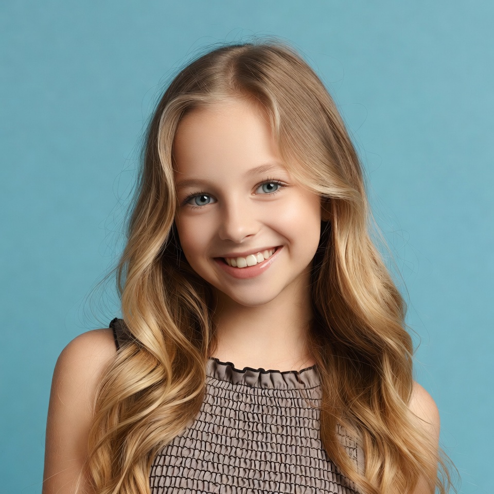 A young girl with long wavy blonde hair smiles happily at the camera. She wears a sleeveless beige top with ruffled neckline and stands against a solid blue background. Her blue eyes are bright and her expression is cheerful.