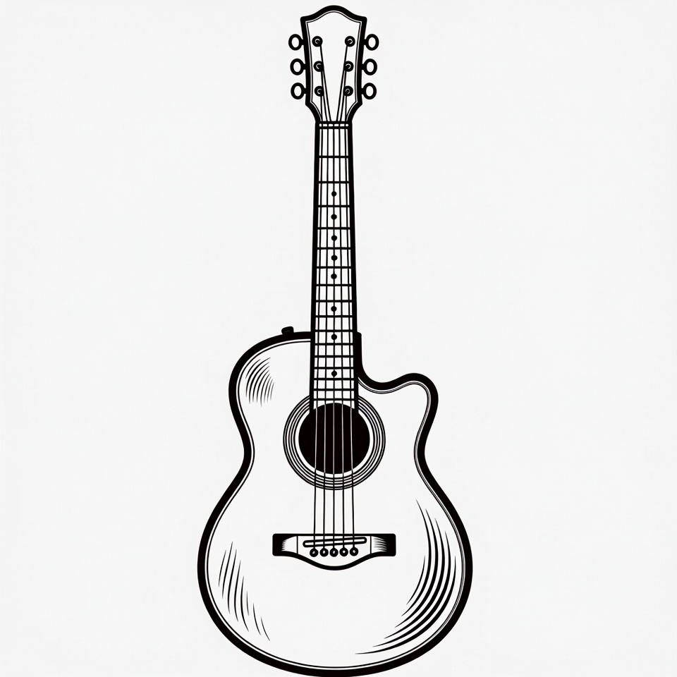 acoustic guitar, black and white, clipart, cutaway guitar, frets, headstock, illustration, isolated background, musical instrument, outline, sound hole, strings, tuning pegs, guitar