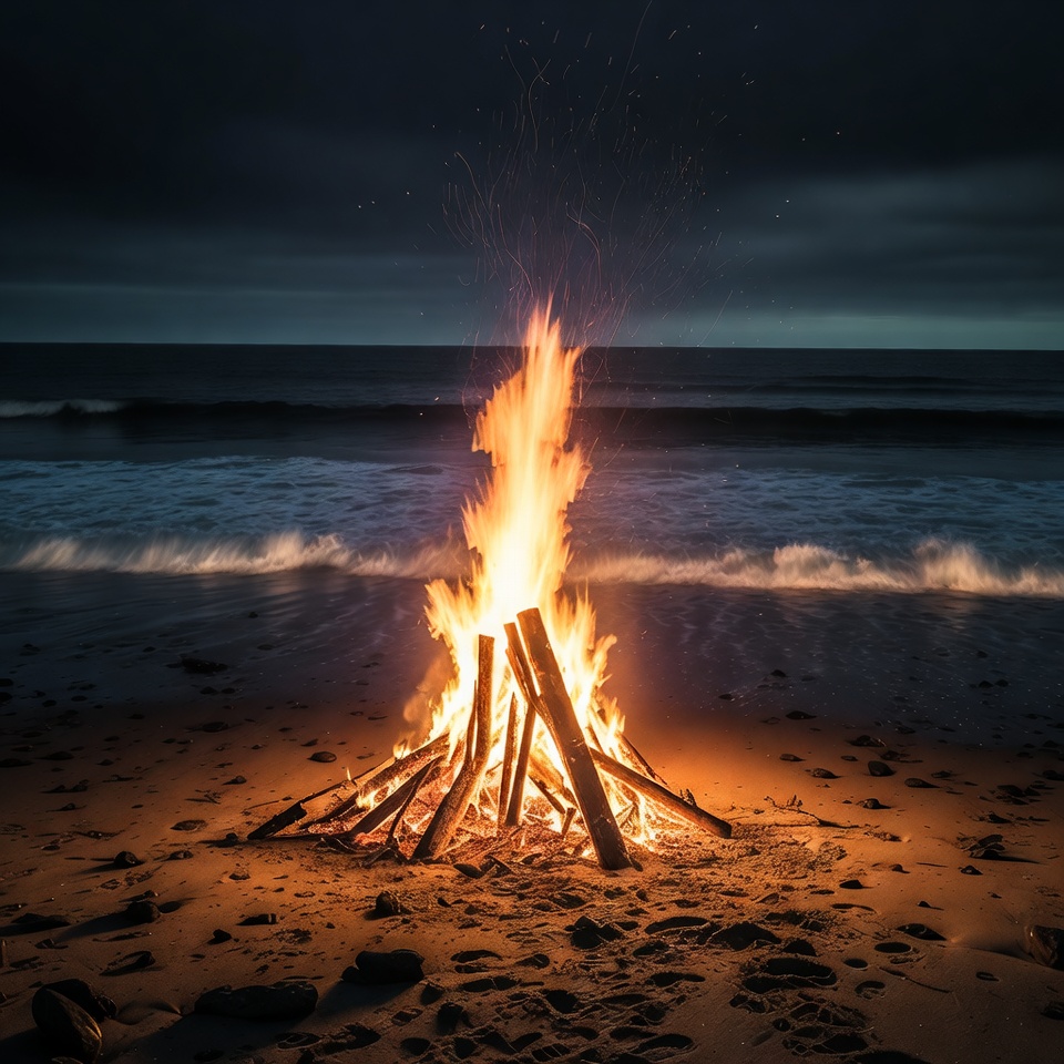 A tall bonfire with bright orange flames and sparks burns on a sandy beach during nighttime. Logs are stacked in a teepee shape, illuminating the surrounding sand and pebbles. Gentle ocean waves crash in the dark background under a cloudy sky.