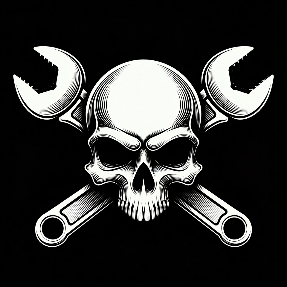 A white line art skull with a menacing expression sits centered on a black background. Two large wrenches cross behind the skull, forming an X shape. The design features bold outlines and detailed shading in a vector illustration style.