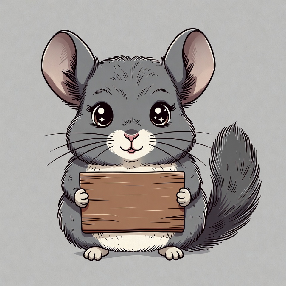 A cute cartoon chinchilla with large sparkling eyes and fluffy gray fur holds a blank wooden sign with both paws. It stands on a light gray background with a happy smile and fluffy tail. The illustration features soft lines and a kawaii style.