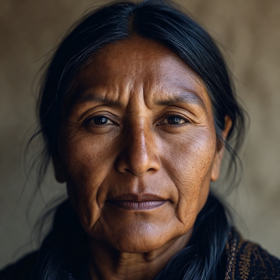 A close-up portrait of an elderly Indigenous woman with long straight black hair framing her face. She has tan skin, dark expressive eyes, and subtle wrinkles around her mouth and eyes. She gazes directly at the camera against a neutral beige background.