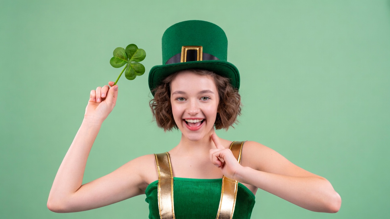 Irish, St Patricks Day, White, costume, curly hair, female, four-leaf clover, gold trim, green background, green dress, green hat, happy, holiday, isolated background, leprechaun costume, luck, pointing, shamrock, smiling, top hat, young woman, girl