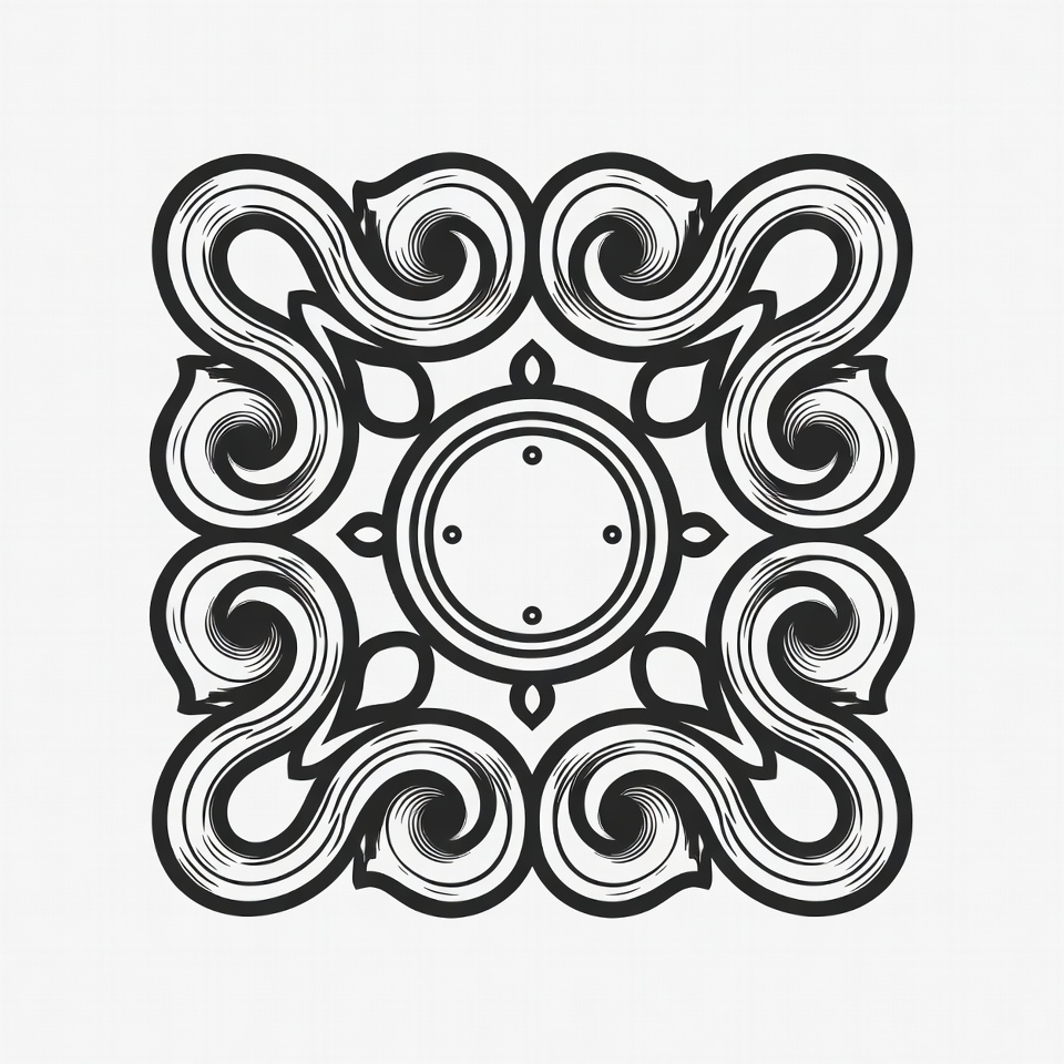 black outline, circular center, clipart, decorative border, floral curls, floral design, illustration, isolated, line art, ornate pattern, square frame, swirl motifs, symmetrical design, vector graphic, white background, mandala