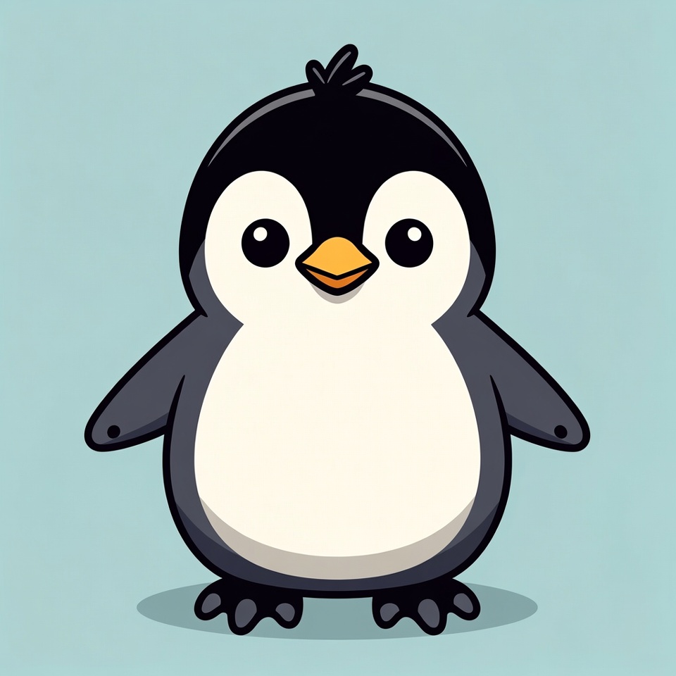 A cute cartoon penguin stands on a light blue isolated background. It has black feathers, a white belly, large expressive eyes, and orange beak and feet. The illustration features bold outlines and a chubby, adorable design.