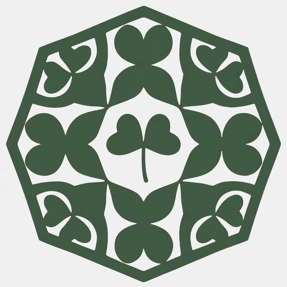 A symmetrical green illustration features a central four-leaf clover surrounded by heart-shaped shamrocks within a hexagonal outline. Multiple clover leaves and stems form an intricate geometric design on a white background. The pattern uses solid green outlines with negative space for contrast.