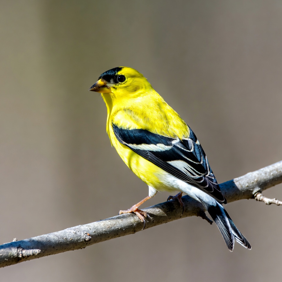 American goldfinch, avian, bird, black wings, branch, feathers, finch, nature, orange beak, perched, songbird, wild bird, wildlife, yellow bird, goldfinch