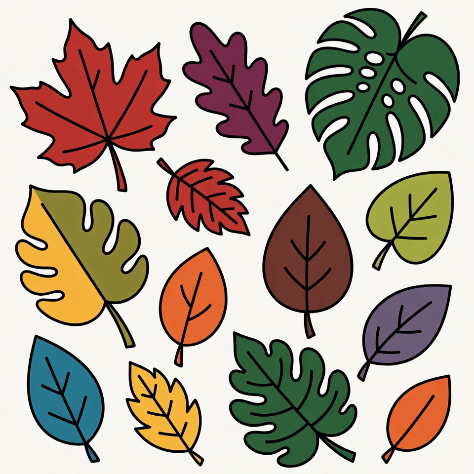 blue leaves, colorful leaves, fall leaves, foliage, green leaves, hand drawn, isolated background, leaf clipart, leaves illustration, line art, maple leaf, monstera leaf, nature, orange leaves, purple leaves, red leaves, seasonal leaves, vector leaves, yellow leaves, autumn leaves
