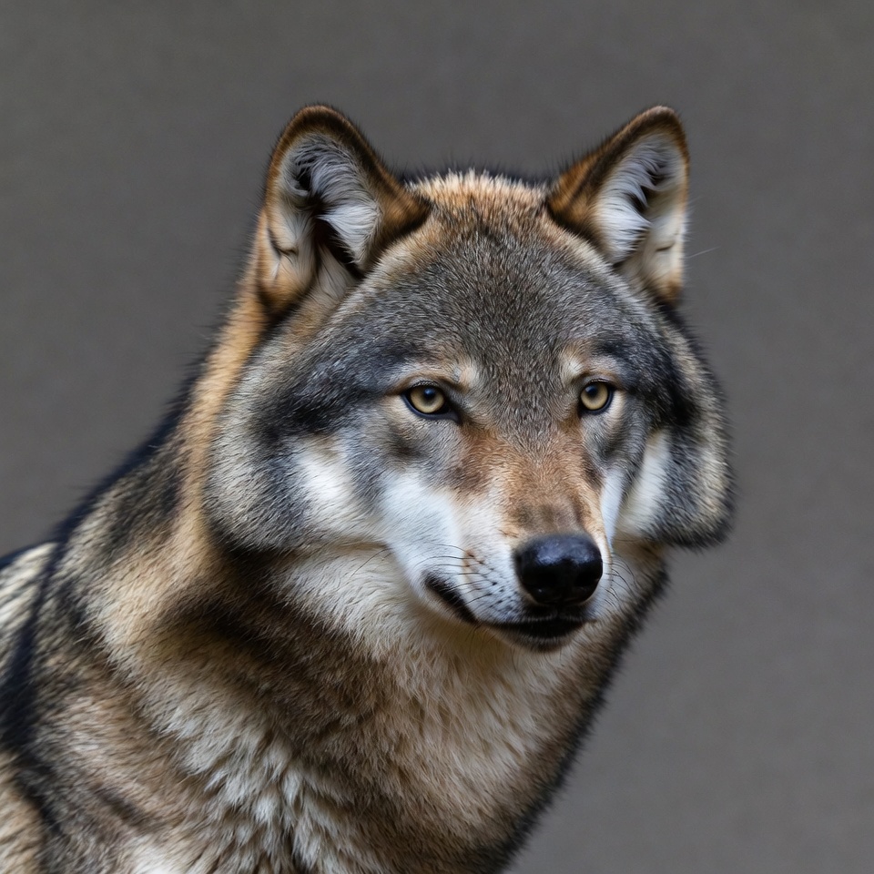 A gray wolf with thick fur in shades of gray, brown, and white stares directly at the camera. Its pointed ears are perked up, and yellow eyes are intense. The wolf is positioned against a plain dark gray background.
