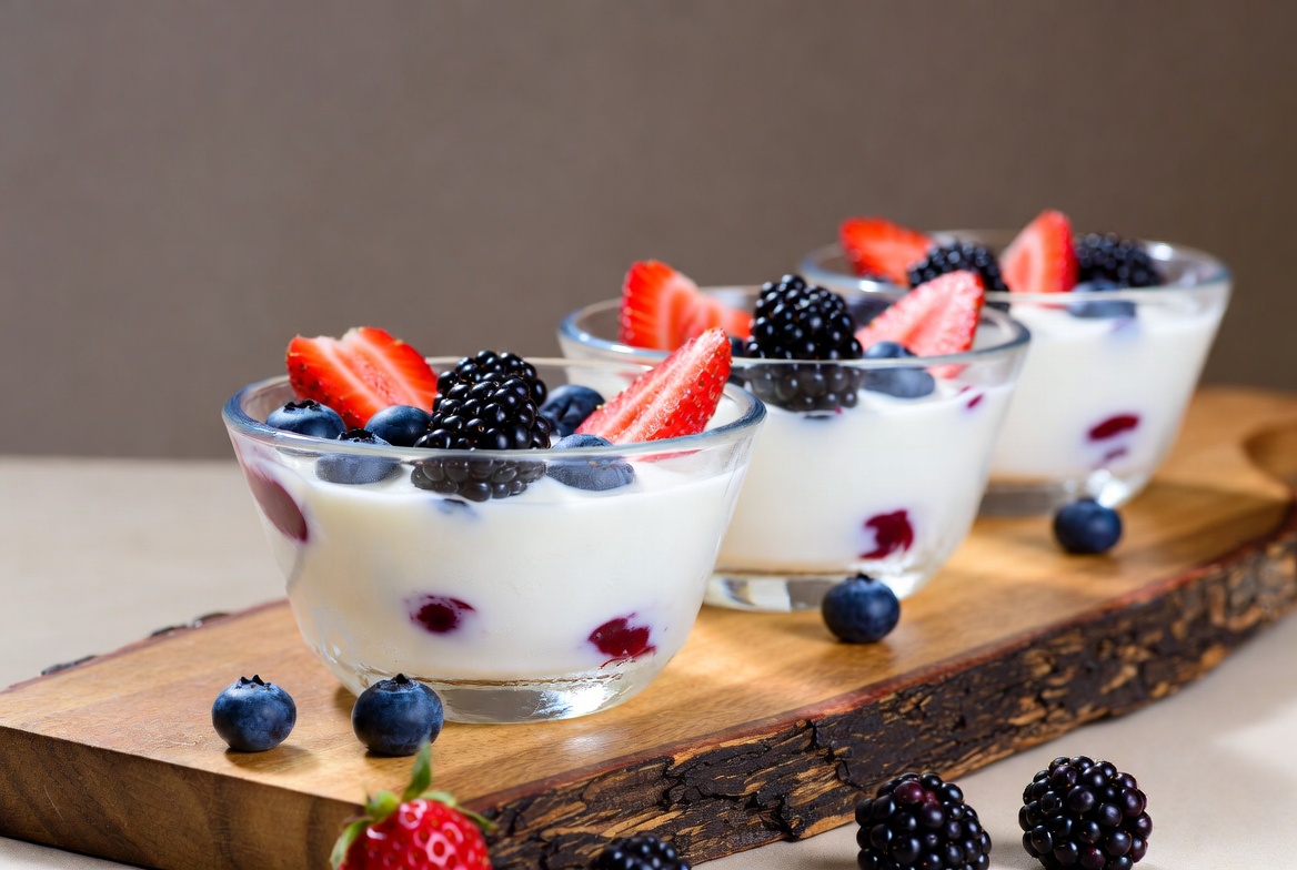 Three glass bowls of creamy white yogurt topped with fresh blueberries and strawberries sit on a wooden board. The berries are vibrant red and blue, arranged attractively on the yogurt. A neutral background highlights the desserts.