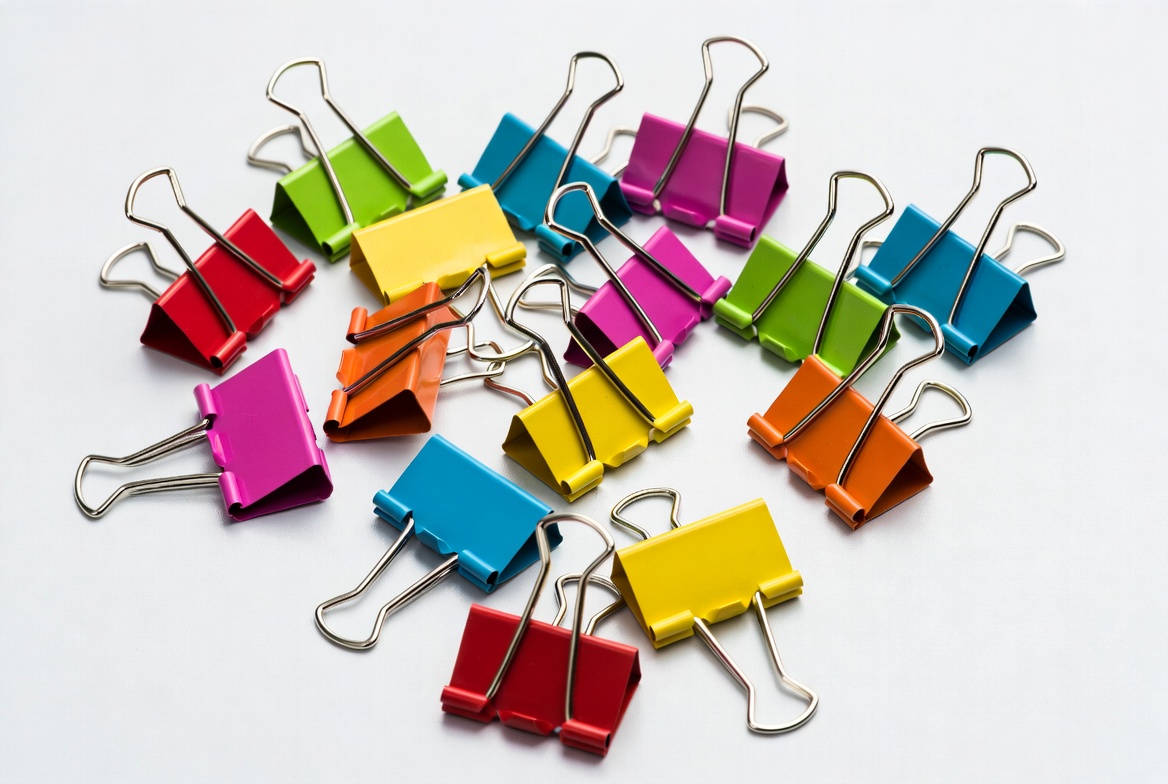 Colorful binder clips on white background