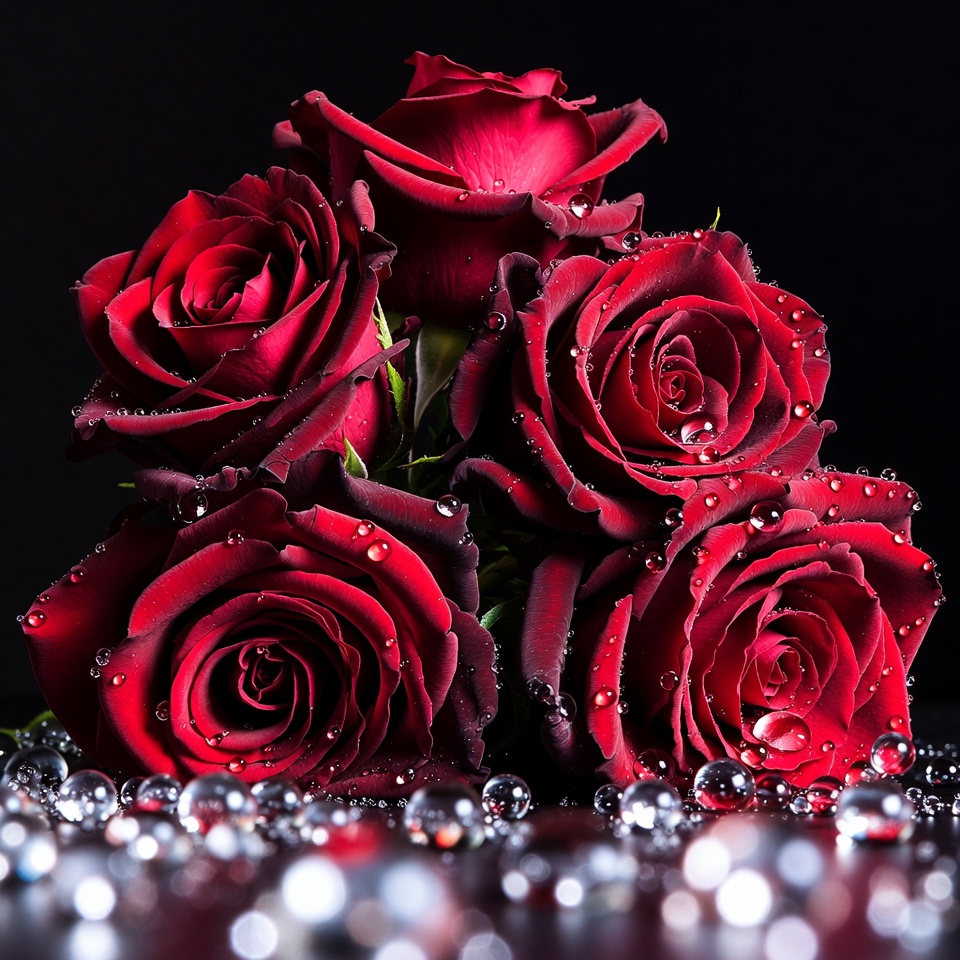 A cluster of vibrant red roses with water droplets sits on a dark surface. The roses are tightly arranged in a bouquet formation, showcasing velvety petals and thorny stems. Sparkling clear beads surround the base, adding a glistening effect.