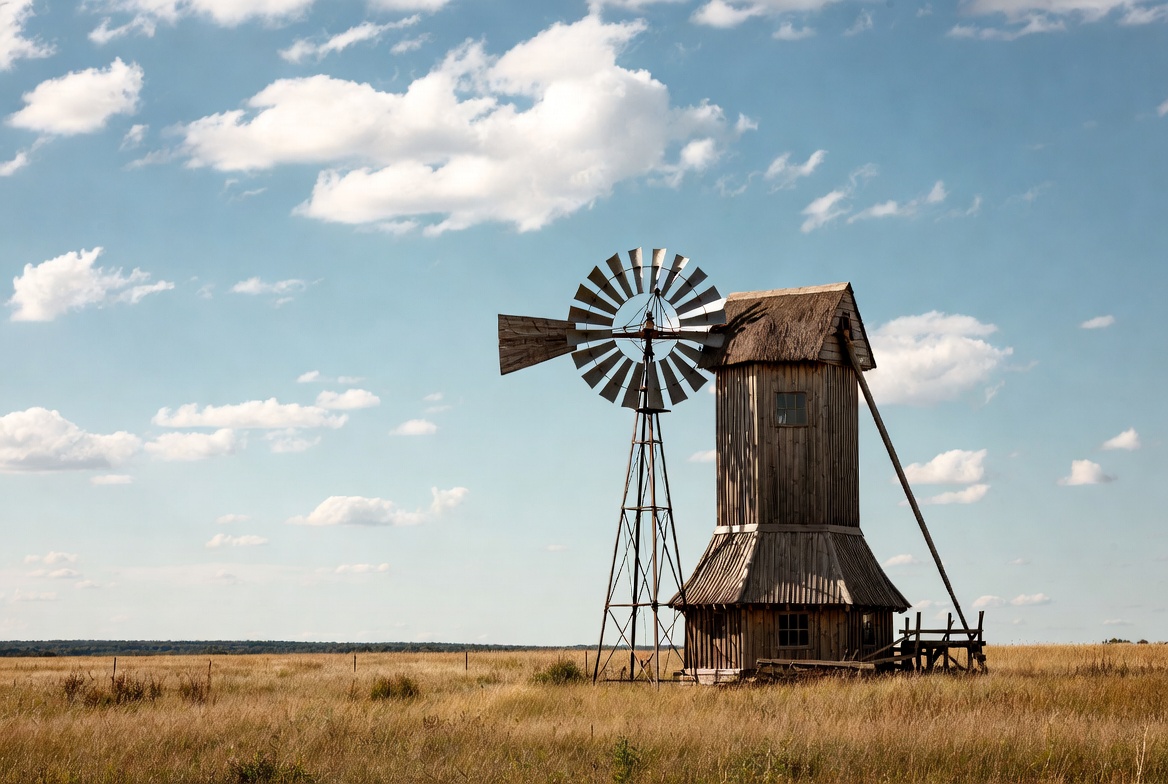 blue sky, countryside, farm windmill, golden grass, grassy field, isolated background, old windmill, prairie, rural landscape, rustic windmill, weathered wood, white clouds, windmill blades, wooden windmill, windmill