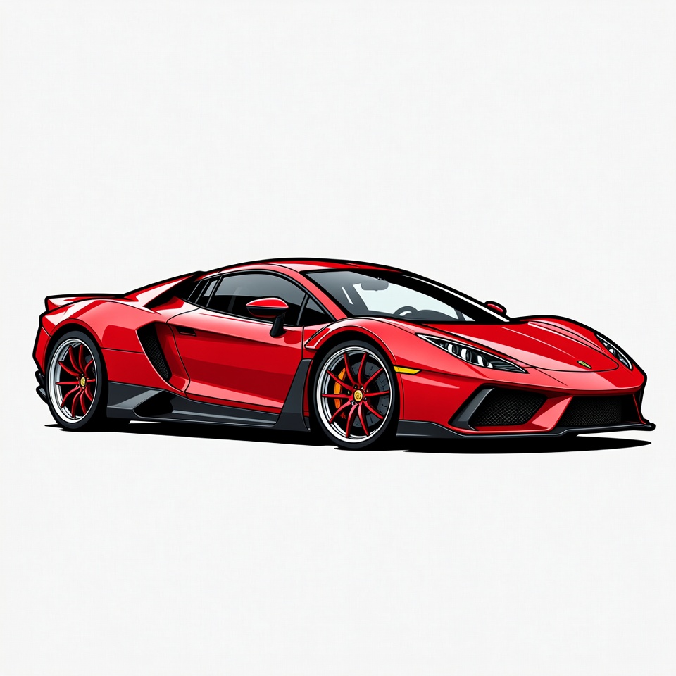 A vibrant red supercar with angular design and large black rims is depicted in a dynamic illustration style. The vehicle features sharp lines, prominent air vents, and red brake calipers against a white isolated background. It has a sleek coupe body with tinted windows and aggressive styling.