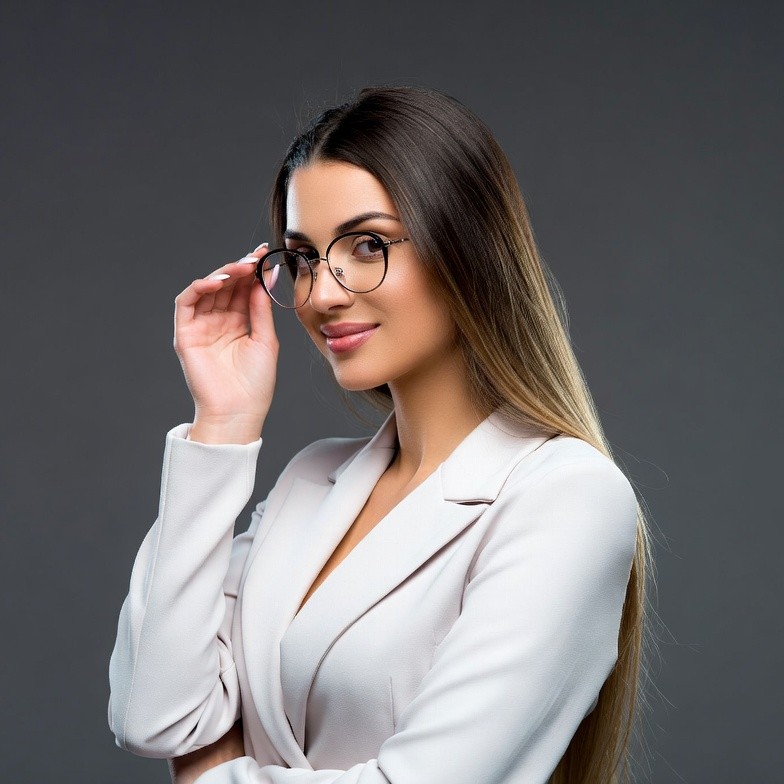 A woman with long brown hair and glasses smiles while adjusting her eyewear with one hand. She wears a white blazer with a deep neckline and stands against a gray background. Her expression is confident and her hair falls straight over her shoulders.