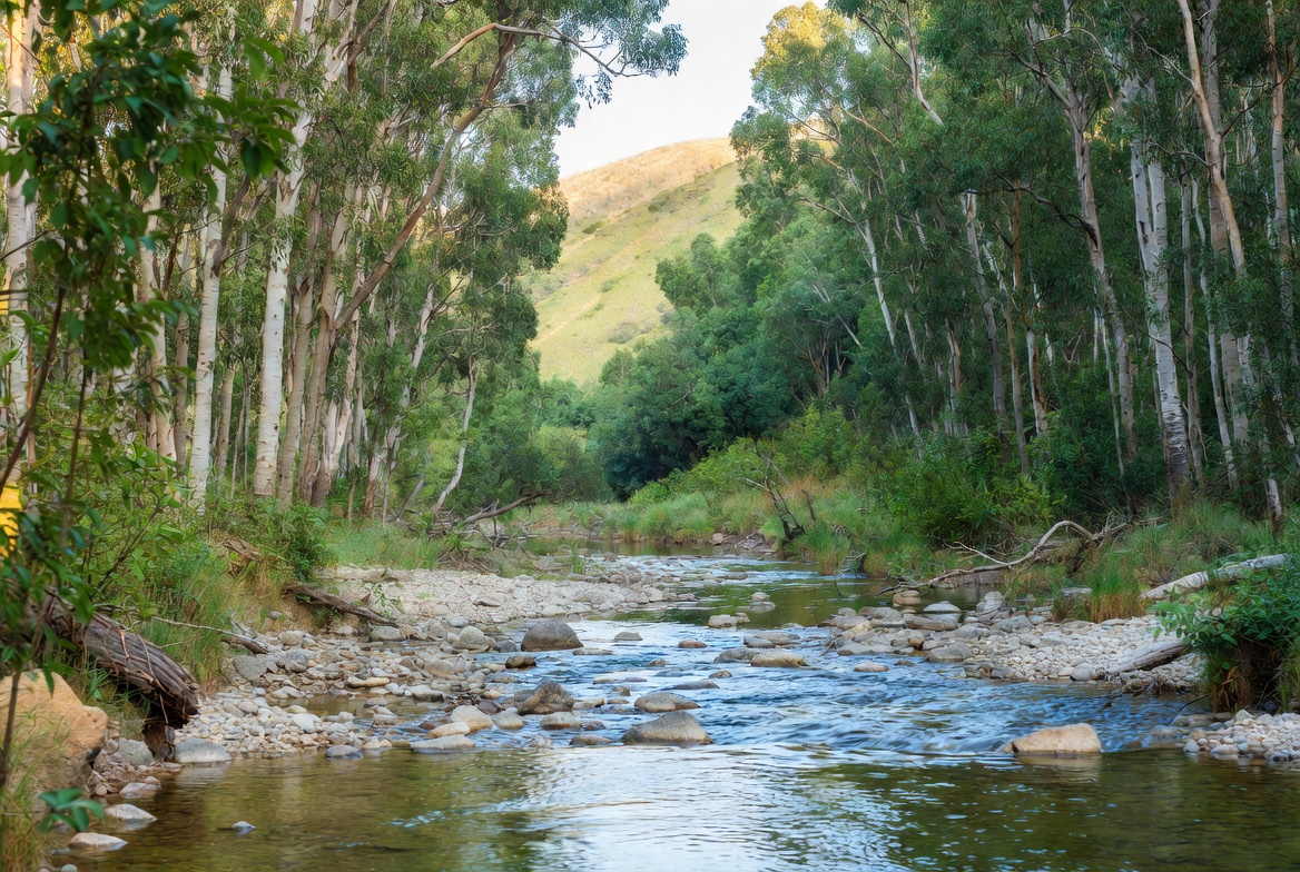 A serene stream flows through a dense forest of tall eucalyptus trees with white trunks and green leaves. The water runs over smooth rocks and pebbles in the foreground, leading the eye toward green hills and mountains in the background. Sunlight filters through the canopy, illuminating the lush greenery.