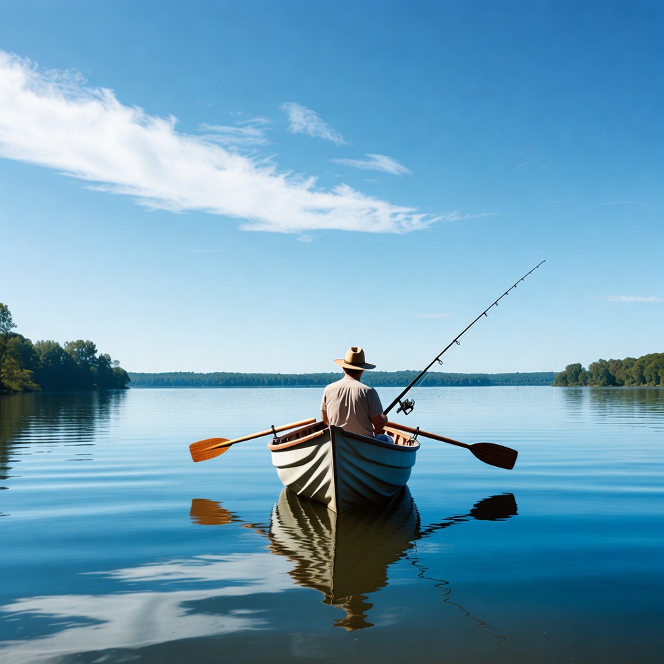 A man wearing a beige hat and light shirt sits in a wooden rowboat on a calm lake, holding a fishing rod. He faces away toward the water with oars resting in the oarlocks. The scene features a clear blue sky, scattered clouds, and distant tree-lined shores with reflections on the water.