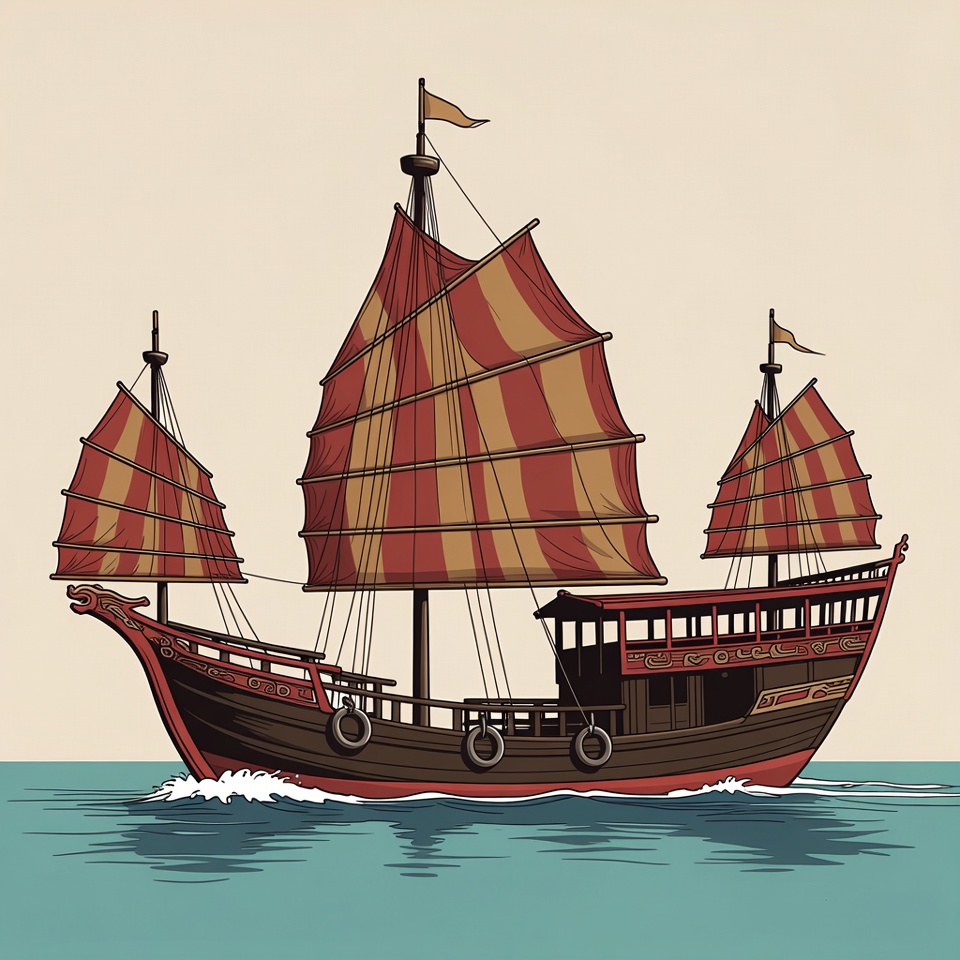 A detailed illustration of a traditional Chinese junk ship with red and orange striped sails sails on calm blue water. The wooden vessel features dragon-headed prow, multiple masts with flags, and ornate deck structures. It is depicted in a vector art style on an isolated background.